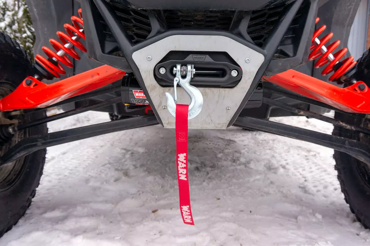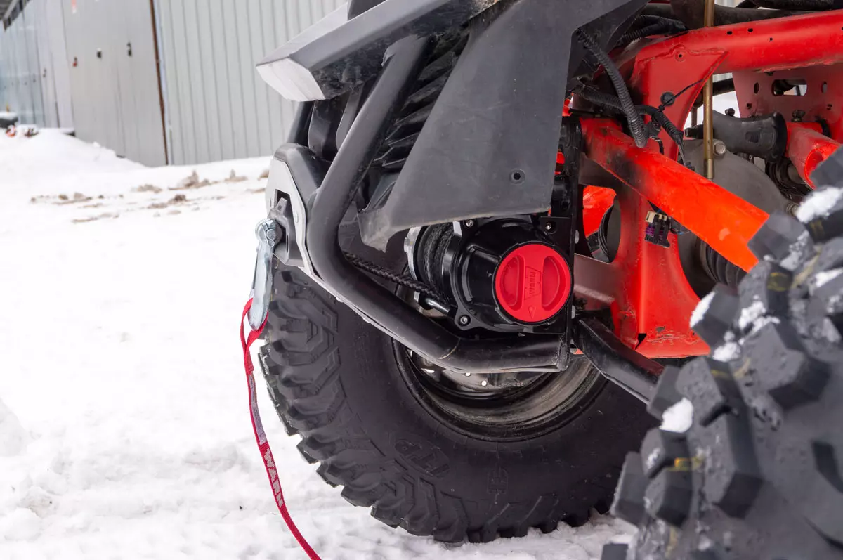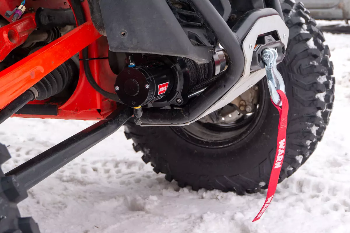 Warn manufacturer's winch allows you to easily pull buggies from heavy road situations such as contaminated areas, deep snow or sand.