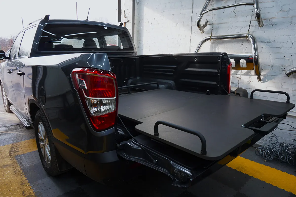 The pallet is designed to fit the dimensions of the F150 pickup truck body. When folded, it does not require much space, so it can be placed in the trunk on a permanent basis. The luggage module is made of thick plywood with a waterproof, non-slip coating. It can withstand from 250 to 500 kilograms of load in the open and closed state, respectively. For ease of use, the luggage module for Ford F150 is equipped with a handle and stops. Inside there is an additional container for placing tools and various equipment. The tray is mounted using corner rails.