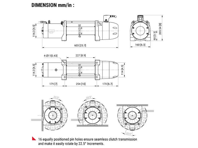 Корпус сделан из литого алюминия и покрыт порошковой краской для защиты от коррозии. Лебедка защищена от влаги по стандарту IP68, ее можно использовать под водой глубиной 1 м до 30 минут.